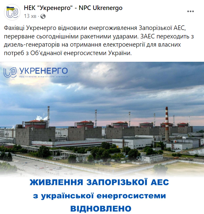 "Специалисты Укрэнерго возобновили энергопитание Запорожской АЭС, прерванное сегодняшними ракетными ударами", — говорится в сообщении.